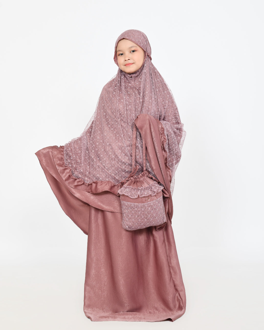 De hoofdkap is voorzien van een elastische band aan de achterkant, zodat de mukena goed blijft zitten tijdens het dragen. Daarnaast zorgt het verstelbare elastiek bij de kin ervoor dat de maat zich gemakkelijk aanpast aan verschillende hoofdgroottes van kinderen.